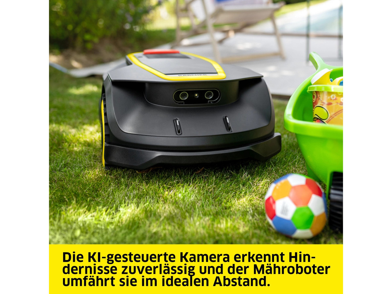 Für maximale Sicherheit ist der RCX 4 mit einer 3D-Kamera zur Hindernis- und Tiererkennung, einem Regen-, Hebe-, Kipp- und Stoßsensor ausgestattet. Der Mähvorgang wird automatisch angepasst oder unterbrochen, wenn es die Situation erfordert. Ein integriertes LCD-Display zeigt den aktuellen Status an und erlaubt grundlegende Einstellungen direkt am Gerät.